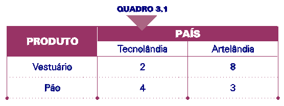 Número de trabalhadores necessários para a produção de uma unidade de cada bem, em cada país. |