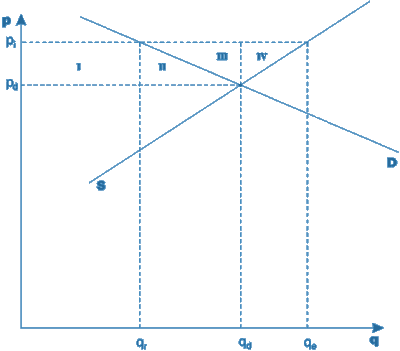 Ao contrário, o produtor sai manifestamente beneficiado, sendo o seu benefício adicional, relativamente à situação inicial, traduzido na figura 4.1 pela soma das áreas I, II, III e IV. A primeira é exactamente aquela que os consumidores perderam e que traduz uma transferência de benefícios interna dos consumidores para os produtores, uma vez que estes agora cobram mais pela mesma quantidade. As outras três decorrem dos ganhos com as exportações que neste caso atingem a quantidade qe – qr. A soma de II e III reflecte o ganho que o produtor tem pelo facto de ter exportado qd – qr a um preço unitário pi, em lugar de ter vendido essa quantidade no mercado doméstico ao preço pe. A zona IV descreve o ganho dos produtores por terem aumentado a sua produção de qd para qe e por terem vendido essa quantidade adicional ao preço pi que lhes proporcionou um excedente. |