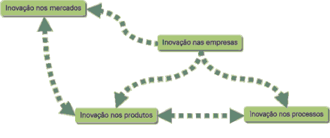 Em geral, um projecto de inovação pode envolver os processos, os produtos, os mercados ou a própria organização da empresa. Há interacções evidentes entre estas diferentes dimensões. Espero deixar claro neste livro que, para uma actividade dinâmica e sustentada de inovação em processos ou produtos, podemos ter de começar por avaliar a necessidade de inovar a própria organização da empresa, de modo a criar um ambiente favorável ao desenvolvimento de uma criatividade orientada para a obtenção de resultados (isto é, para a inovação empresarial). |
