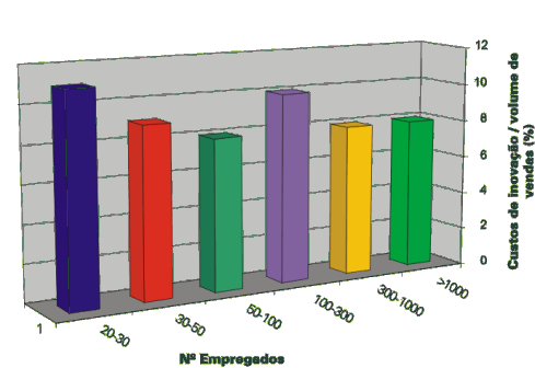 Este gráfico mostra que as empresas “inovadoras” investem praticamente o mesmo (em valor relativo) na inovação, independentemente do seu tamanho – em valores absolutos, as maiores empresas têm possibilidade de efectuar trabalhos de mais elevados custos. |