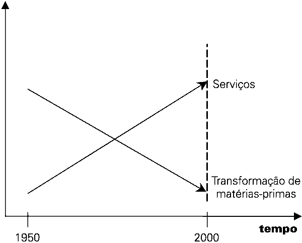 Em qualquer dos casos, a tendência que se tem vindo a assistir a nível mundial é a crescente importância que as empresas atribuem ao serviço, por contraponto com o passado em que a preocupação primeira se encontrava centrada na transformação das matérias-primas. Esta tendência corresponde à inversão do sentido da abordagem do mercado, em que a satisfação das necessidades dos clientes é a preocupção primeira. A distribuição e a produção, secundária e/ou primária, é que têm de se adaptar às necessidades dos clientes e não os clientes às limitações da produção (figura 3.2).