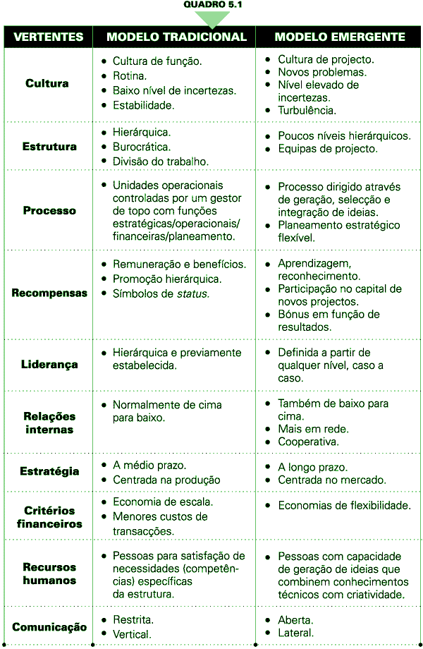 Quadro 5.1 - Modelo tradicional vs. modelo emergente de organização: